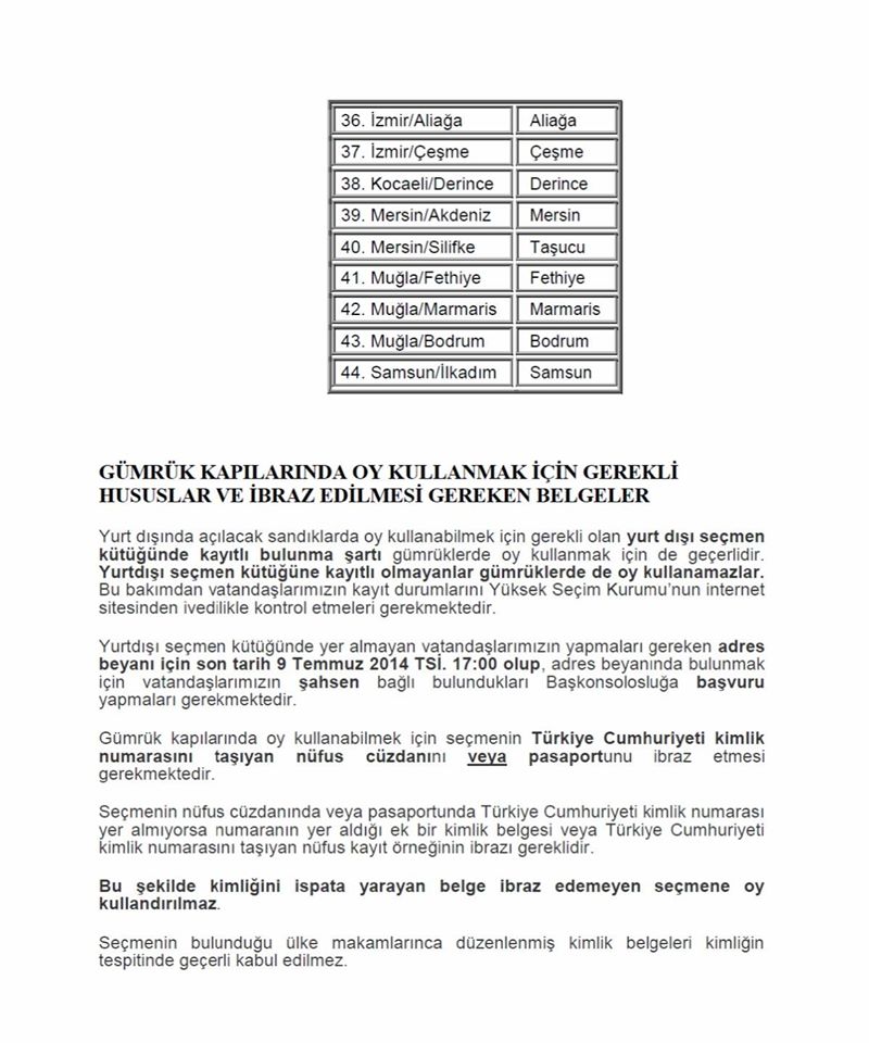 - Büyükelçiliğimizde oy kullanamayacak vatandaşlarımız oy kullanmak istedikleri takdirde, listesi ilişikte takdim kılınan Türkiye’deki karayolu, havalimanı ve liman gümrük kapılarında oy kullanabileceklerdir.