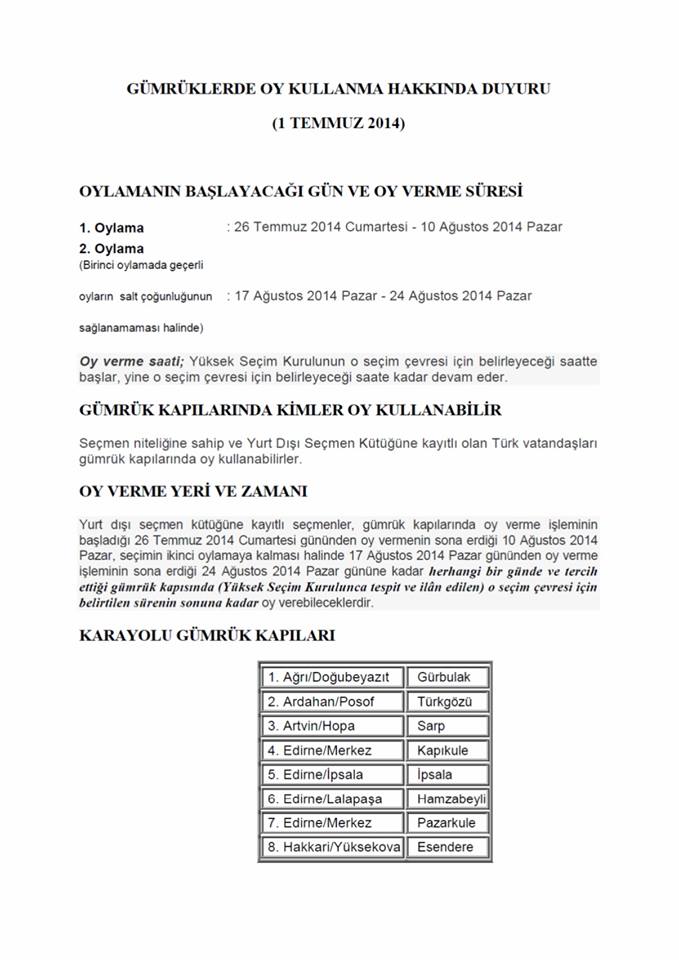 - Gümrük kapılarındaki oy kullanma tarihleri boyunca (birinci tur oylama 26 Temmuz 2014 - 10 Ağustos 2014, seçimin ikinci tur oylamaya kalması halinde ise 17 - 24 Ağustos 2014) seçmenlerin yurda giriş çıkış yapıp yapmadıkları şartı aranmaksızın, herhangi bir günde ve YSK tarafından tespit ve ilan edilen gümrük kapılarından herhangi birinde (Gümrük kapıları listesi YSK’nın www.ysk.gov.trinternet sitesinde kayıtlıdır), o çevre için belirtilen sürenin sonuna kadar oy kullanmaları mümkündür.