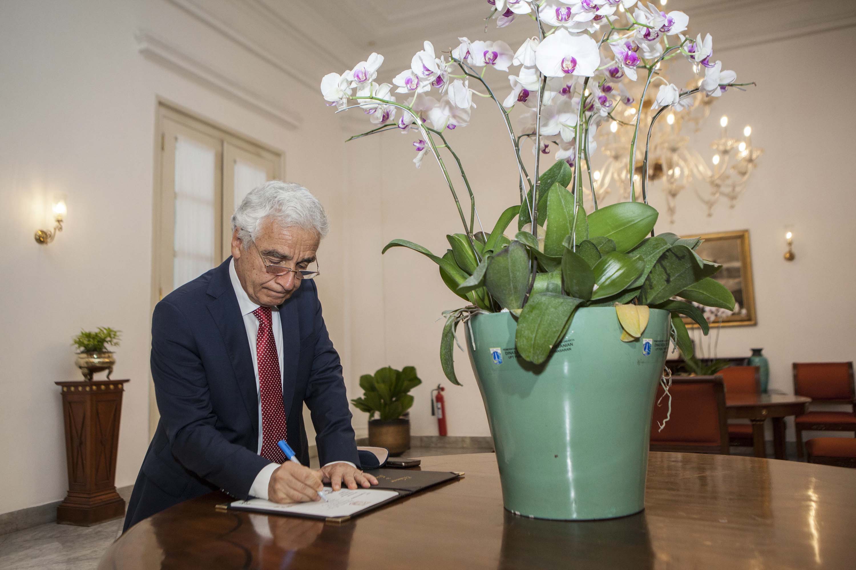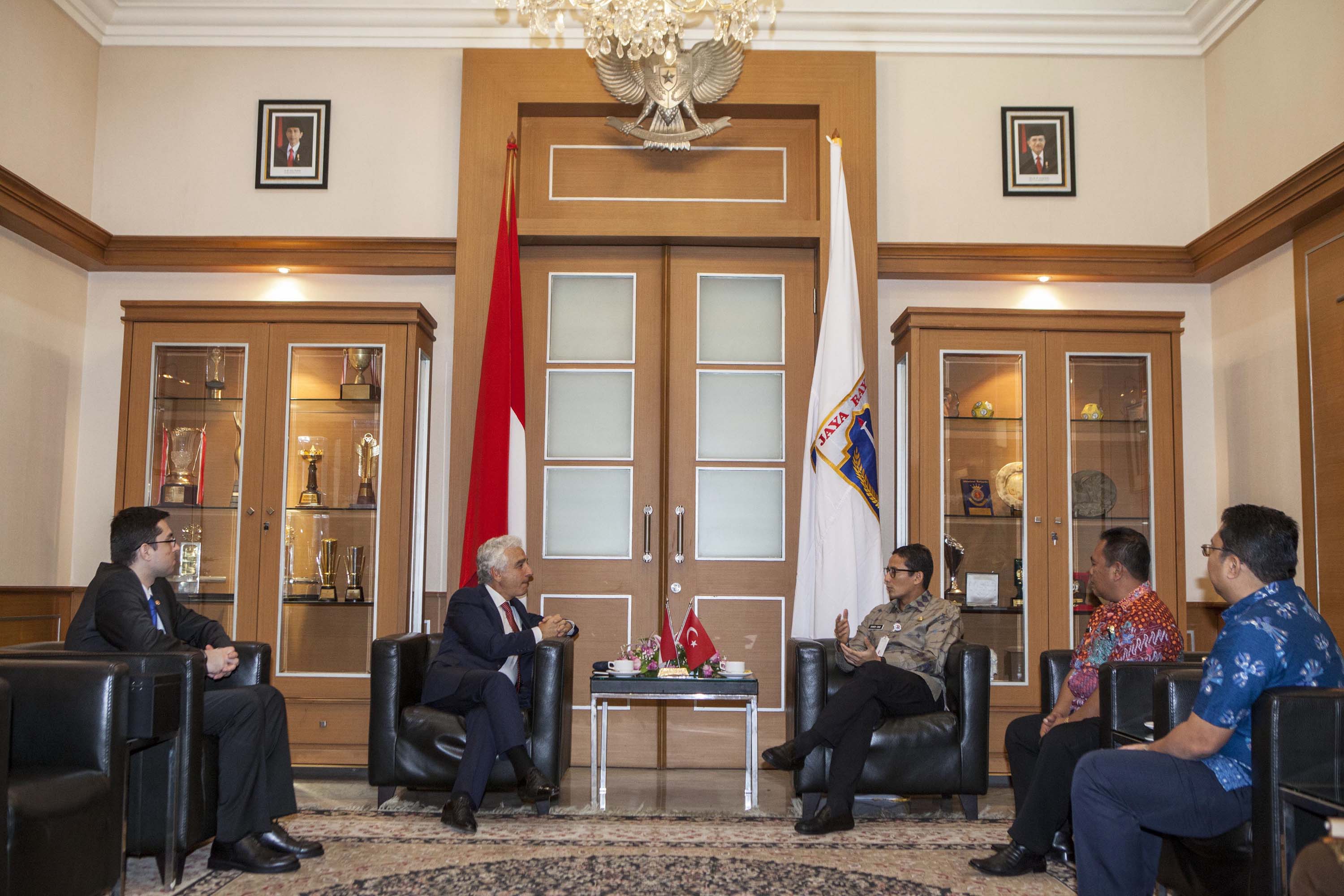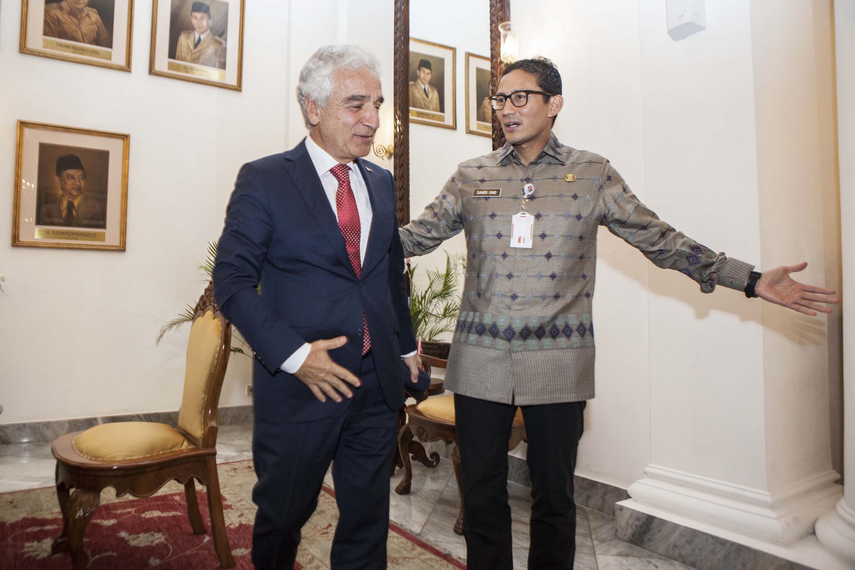 Büyükelçimiz Sayın Dr. Şander Gürbüz ahiren görevine başlayan Cakarta Vali Yardımcısı Sandiaga Salahuddin Uno ile bugün (15 Şubat 2018) Cakarta Valiliği’nde bir görüşme gerçekleştirmiştir. Görüşmede, Türkiye ve Endonezya arasında işbirliği imkanları değerlendirilmiş; Cakarta ve İstanbul arasındaki kardeş şehir ilişkisinin geliştirilmesi konusunda fikir alışverişinde bulunulmuştur.