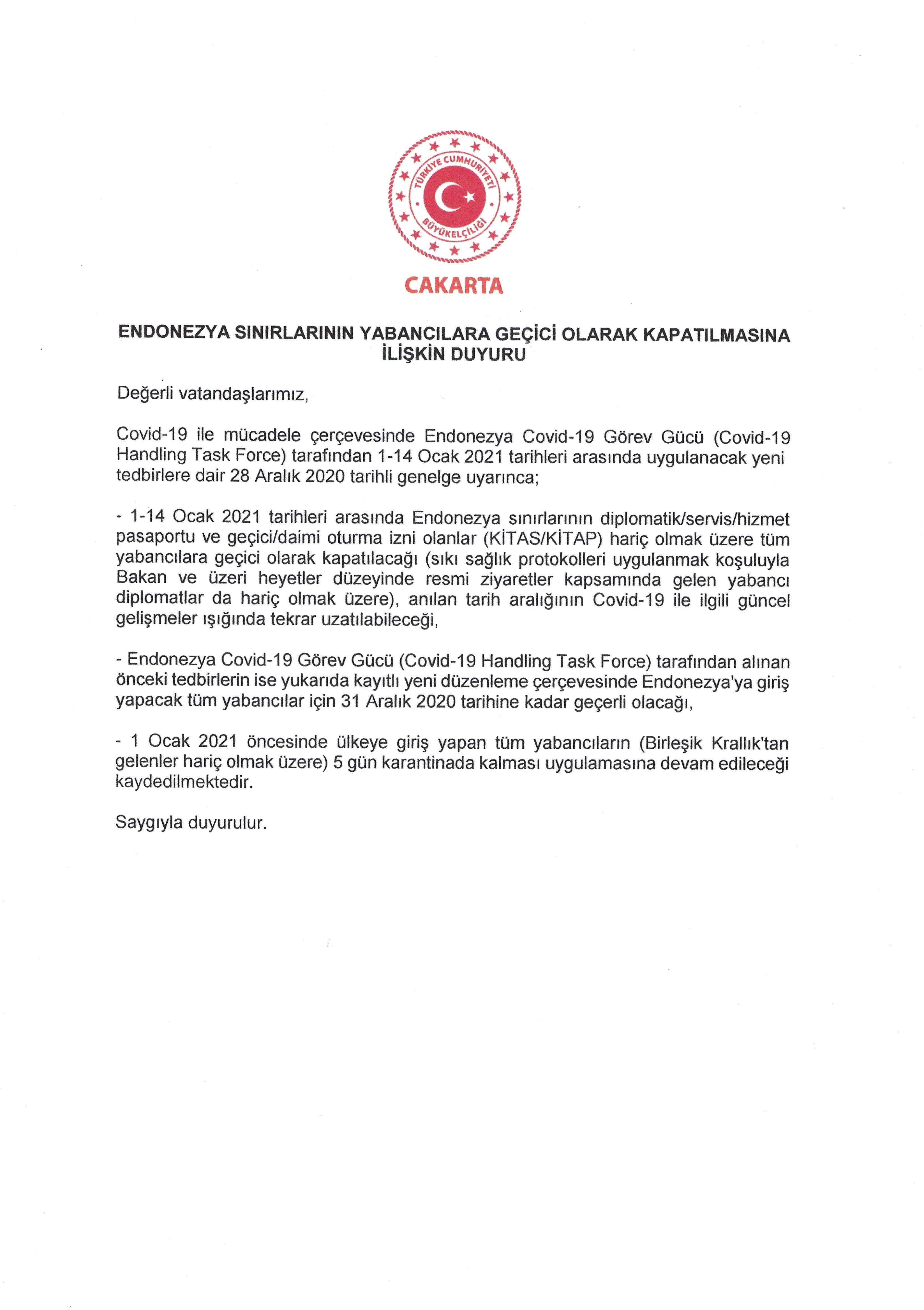 Endonezya Sınırlarının Yabancılara Geçici Olarak Kapatılmasına İlişkin Duyuru