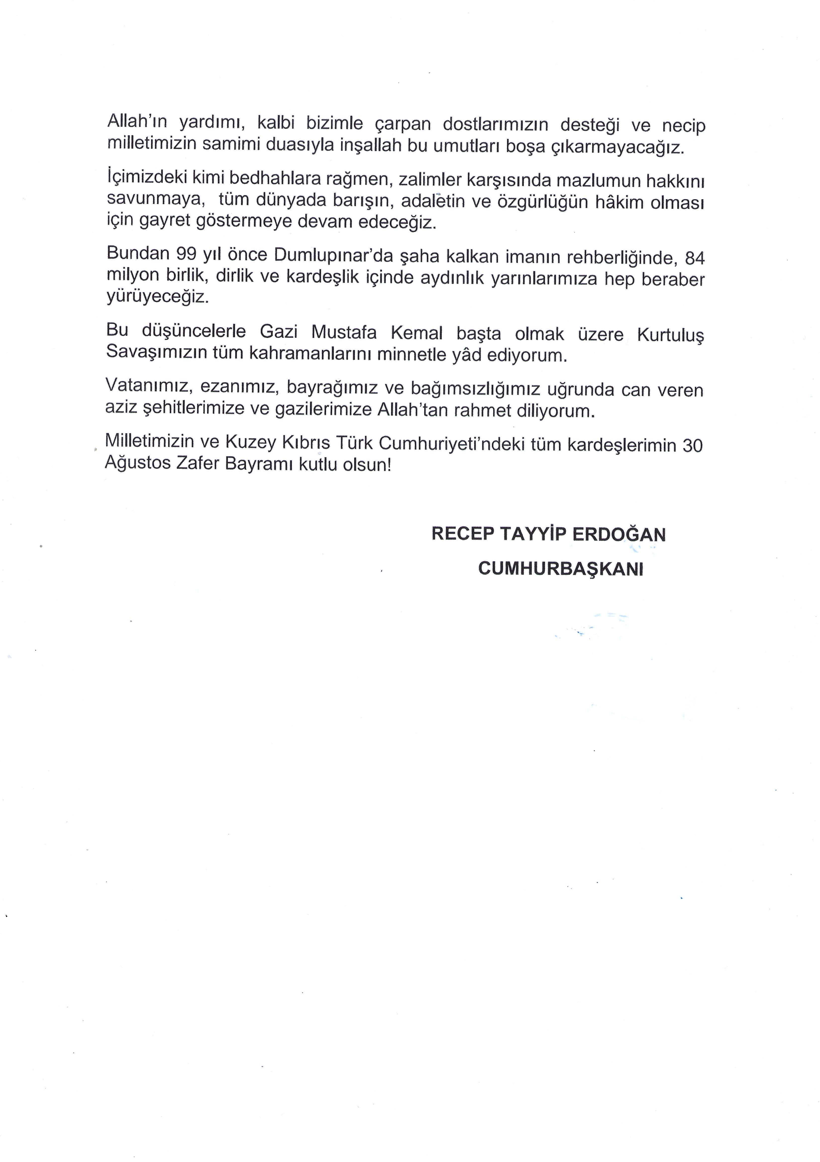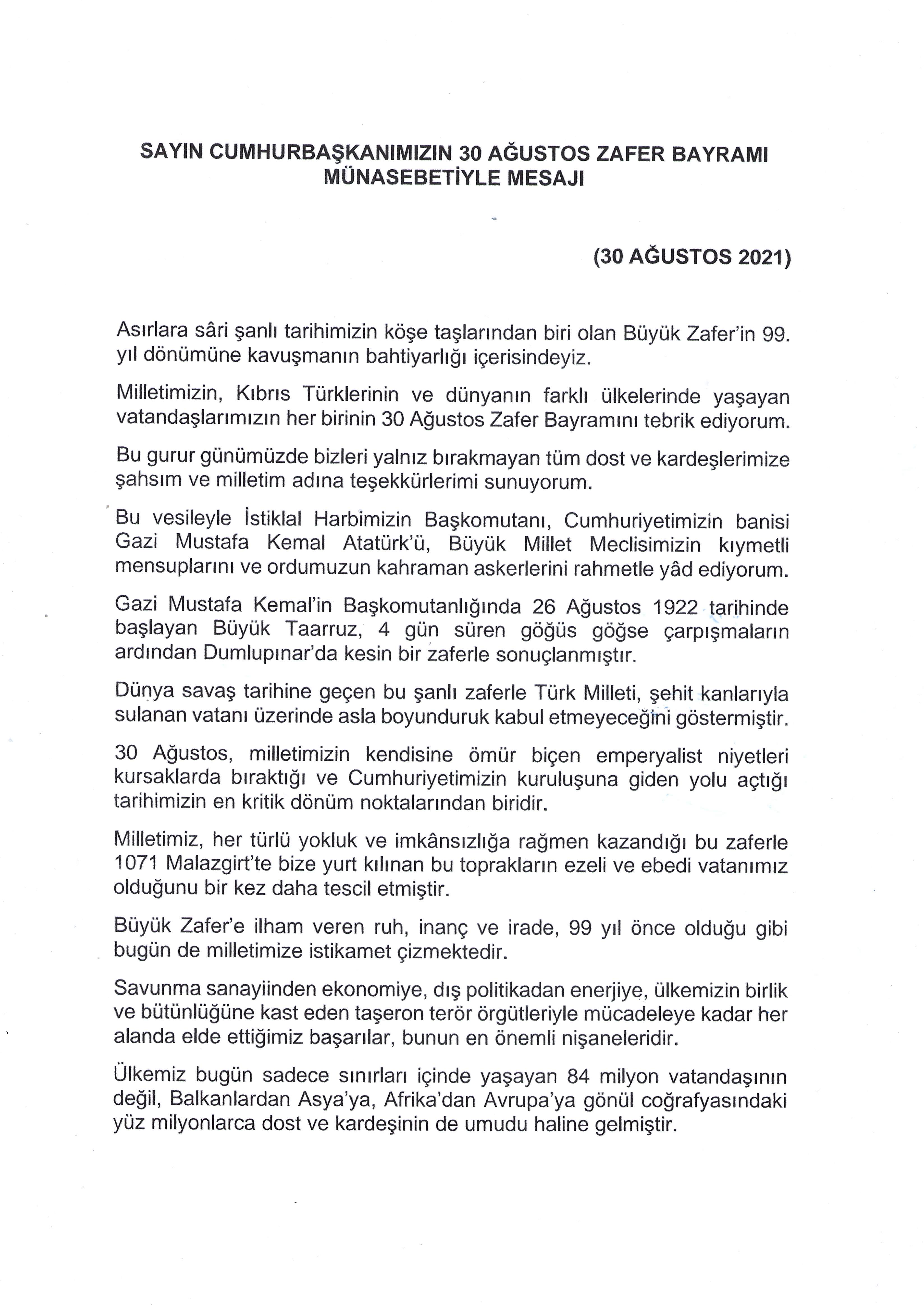 Sayın Cumhurbaşkanımızın 30 Ağustos Zafer Bayramı münasebetiyle mesajı