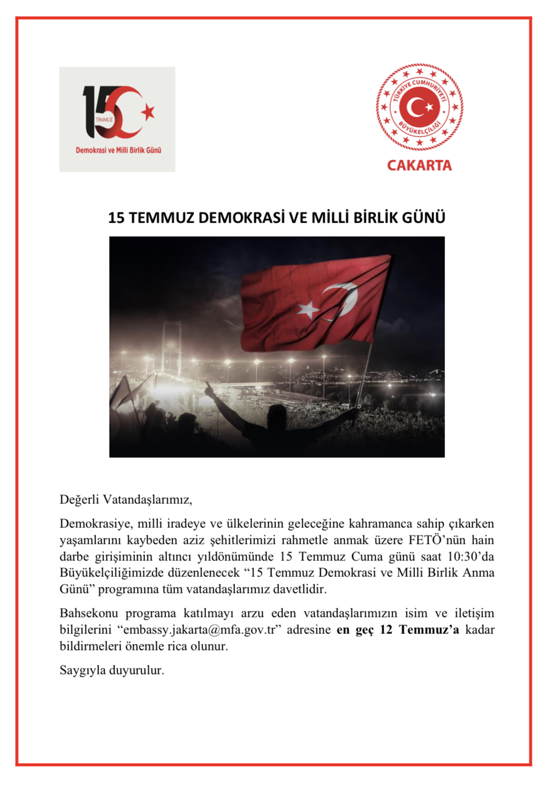 15 Temmuz Cuma Günü Saat 10:30'da Büyükelçiliğimizde gerçekleştirilmesi öngörülen "15 Temmuz Demokrasi ve Milli Birlik Günü" Anma Etkinliğine ilişkin duyurumuzekte sunulmaktadır.